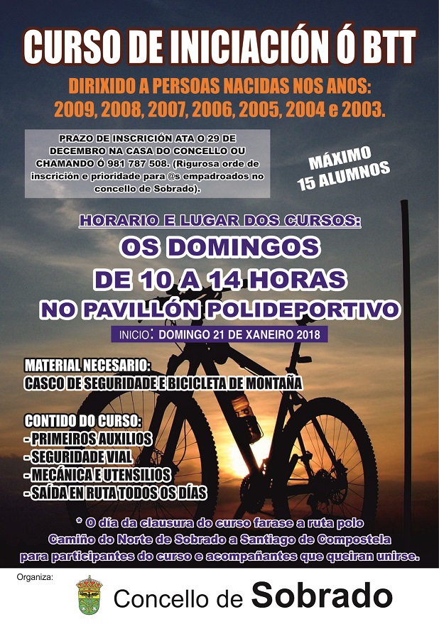 O Concello de Sobrado organiza un Curso de Iniciación ó BTT para persoas nacidas nos anos 2003, 2004, 2005, 2006, 2007, 2008 e 2009. O curso terá un máximo de 15 alumnos que serán inscritos en rigurosa orde de inscrición (sempre con prioridade para as persoas empadroadas en Sobrado). Comezará o domingo 21 de xaneiro no Pavillón Polideportivo Municipal en horario de 10 a 14 horas.
