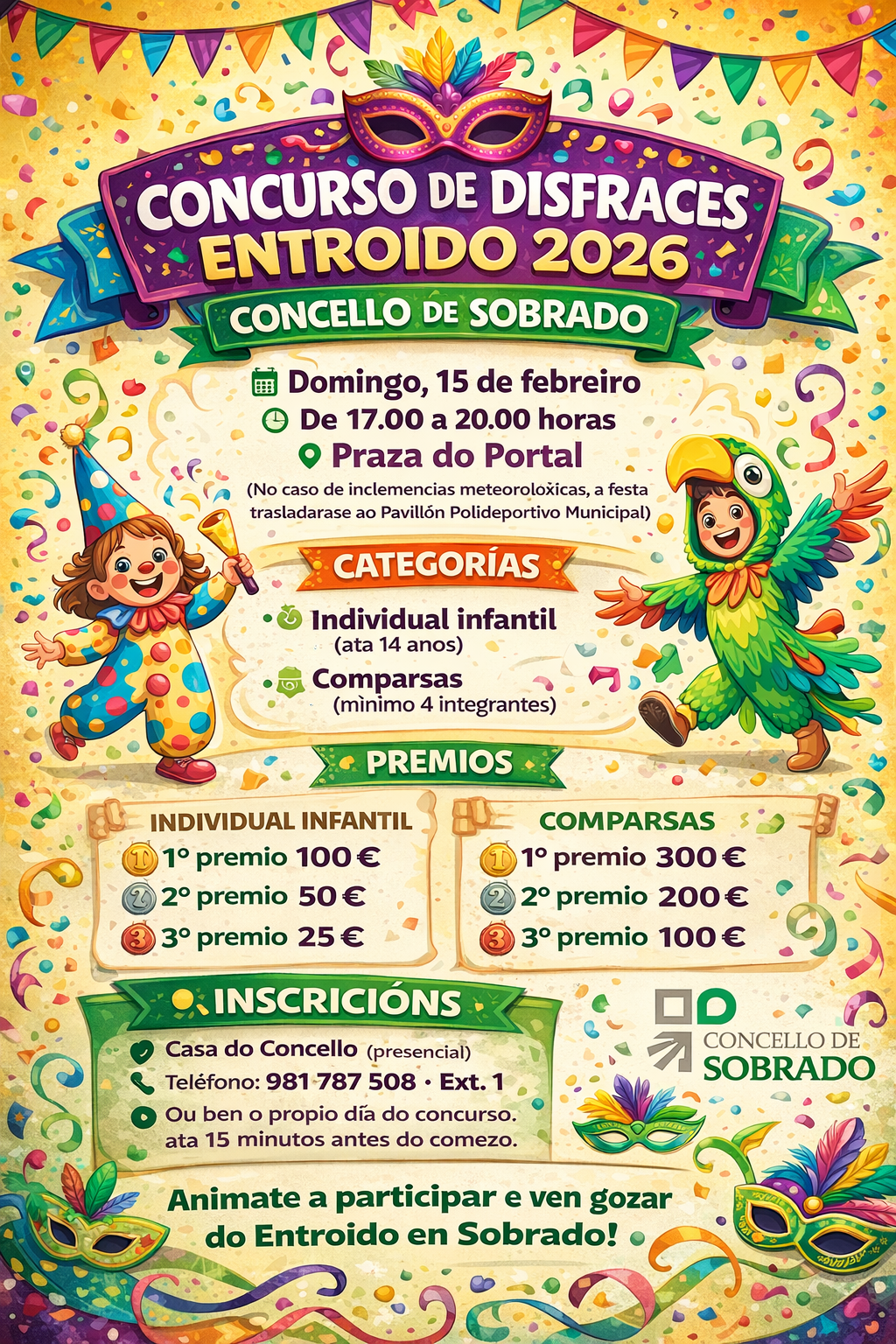 O Concurso de Disfraces Sobrado 2026 terá lugar o domingo día 15 de febreiro ás 17:00 horas rematando ás 20:00